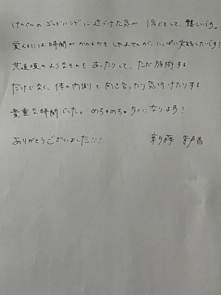 けんさんのゴッドハンドに近づけた気が1%でもして、嬉しいです。覚えるには時間がかかるかもしれませんがいっぱい実践したいです。
